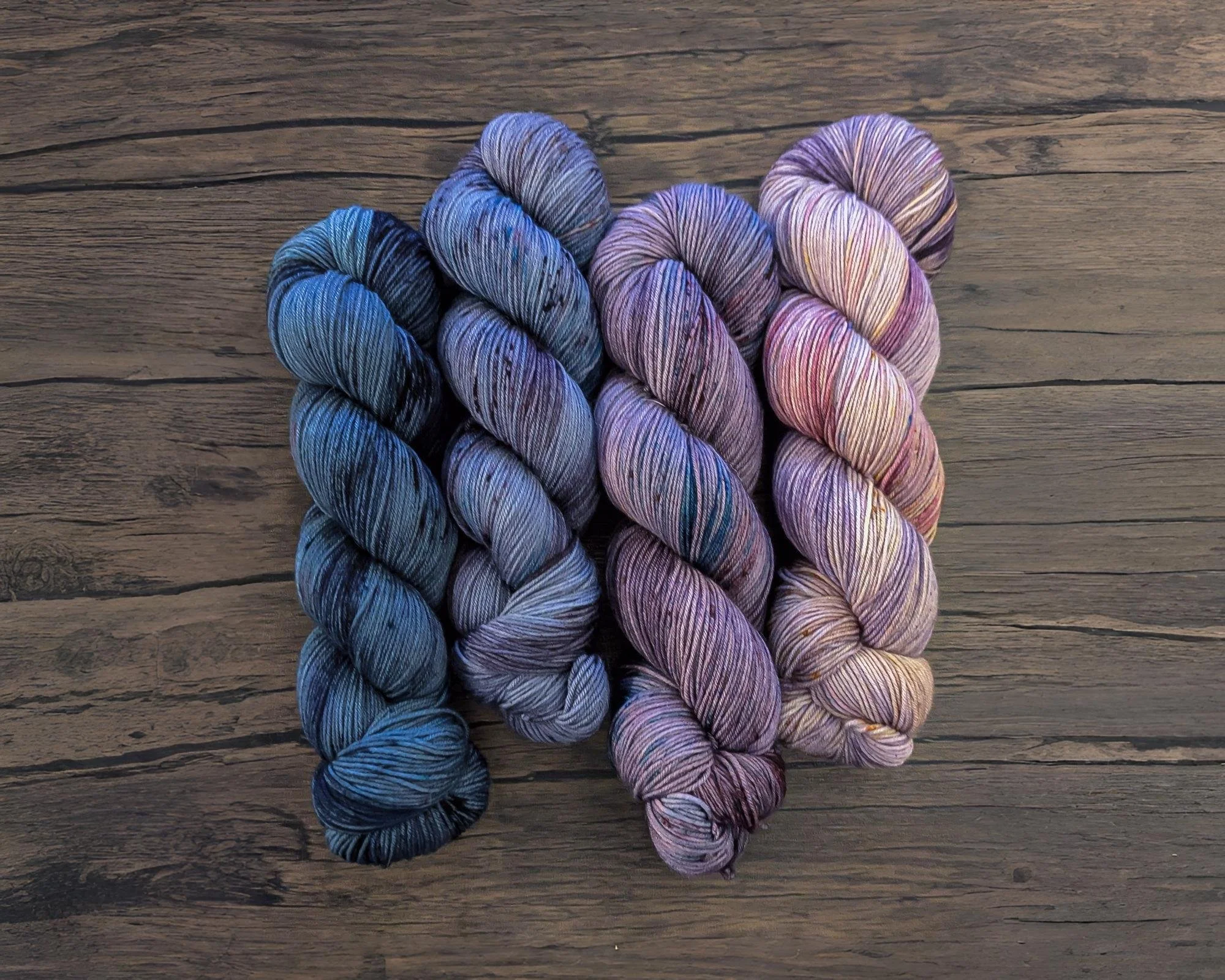 Glimmer holds the first hint of light at the beginning of the sunrise. I dyed this colorway in deep periwinkle with soft shifts of purple and blue that blend into one another like the moment the sky starts to brighten but the sun has not yet climbed the horizon. The tones stay rich and saturated while still carrying that sense of early morning quiet.